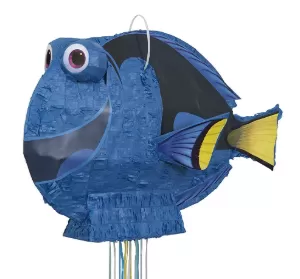 A pinhata tem uma abertura para colocar os brindes e doces, e depois de pendurar basta puxar os fios em baixo para romper e os brindes caírem.