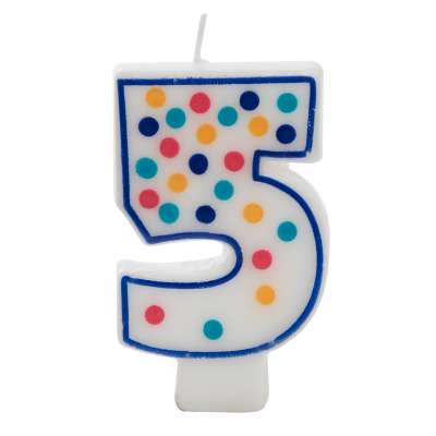 Vela branca nº 5 com rebordo azul e pintinhas de cores sortidas. Vela divertida para qualquer tema!