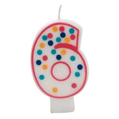 Vela branca nº 6 com rebordo vermelho e pintinhas de cores sortidas. Vela divertida para qualquer tema!